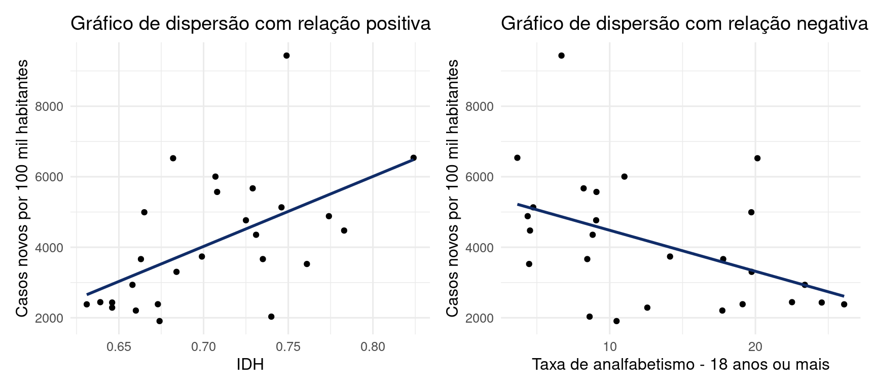 O grau de associação também pode ser medido pela correlação. O gráfico de dispersão, no entanto, mostra uma informação mais rica do que a correlação consegue mostrar.